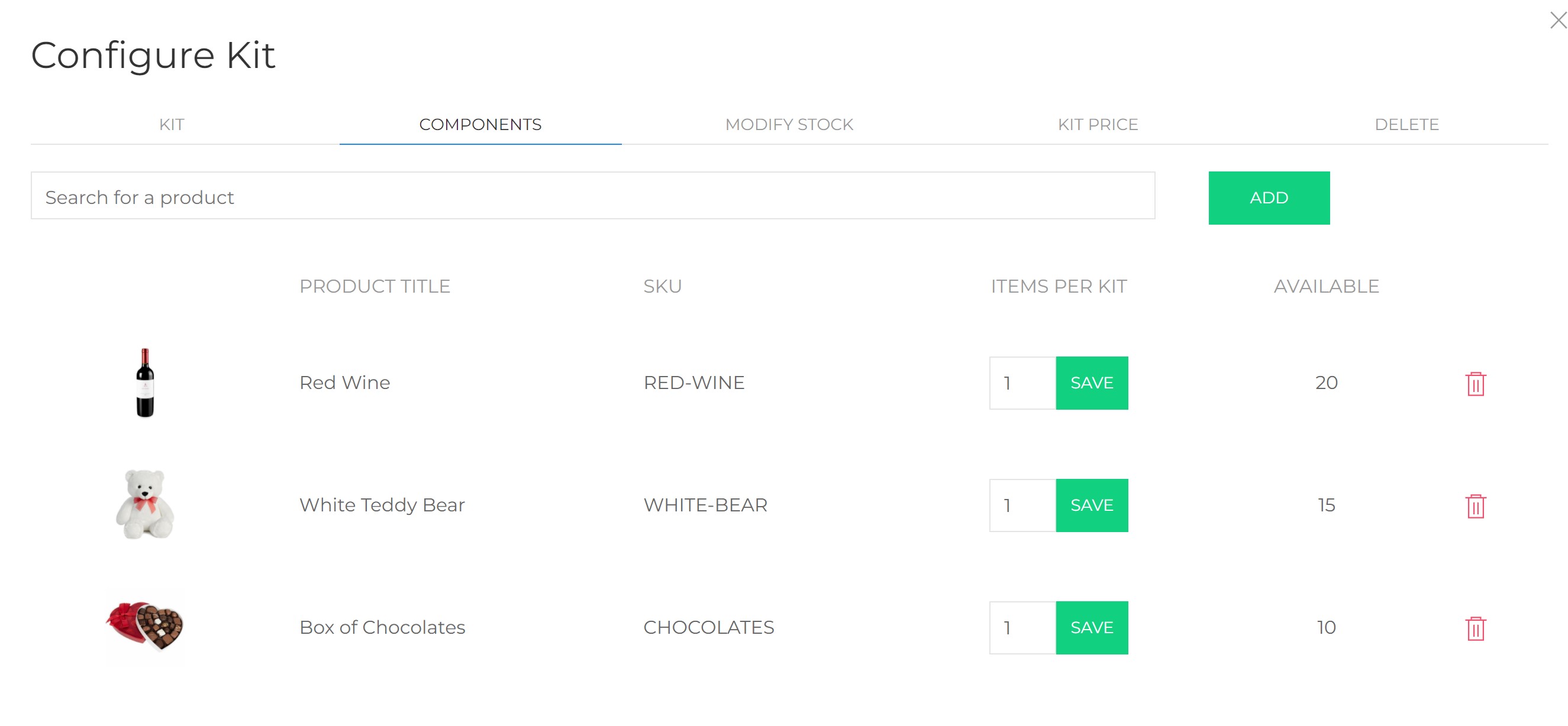 Here you specify components - products from your store that are kit parts. Start typing the name or SKU of the product, then select one from the suggestion list. Press SAVE to add the component to the kit. Add as many items as you want, or remove components from the kit by pressing the trash icon.