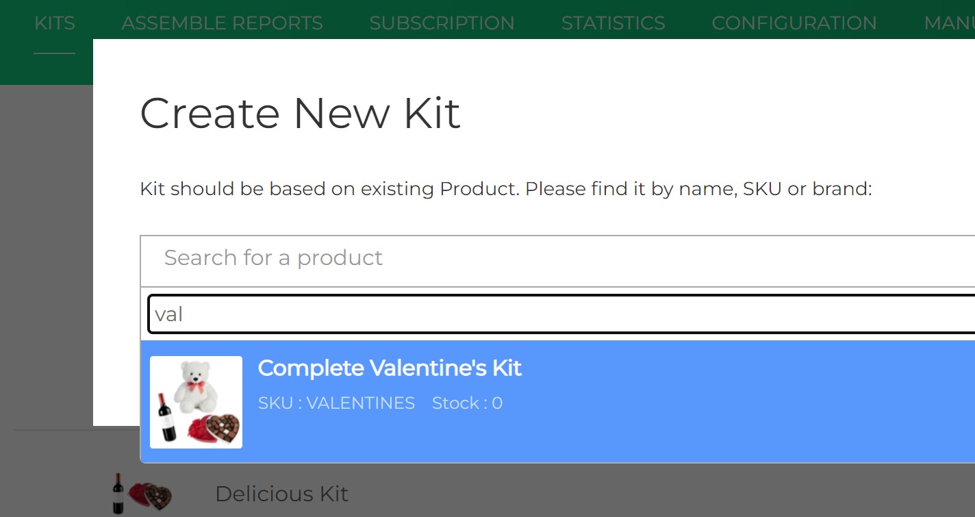 Click ADD KIT to create a new kit. You'll search for an existing BigCommerce(which you created to make a kit) product to identify as a kit and press CREATE to confirm. Each product selected to become a kit must have inventory tracking enabled for Kit Builder to work correctly.