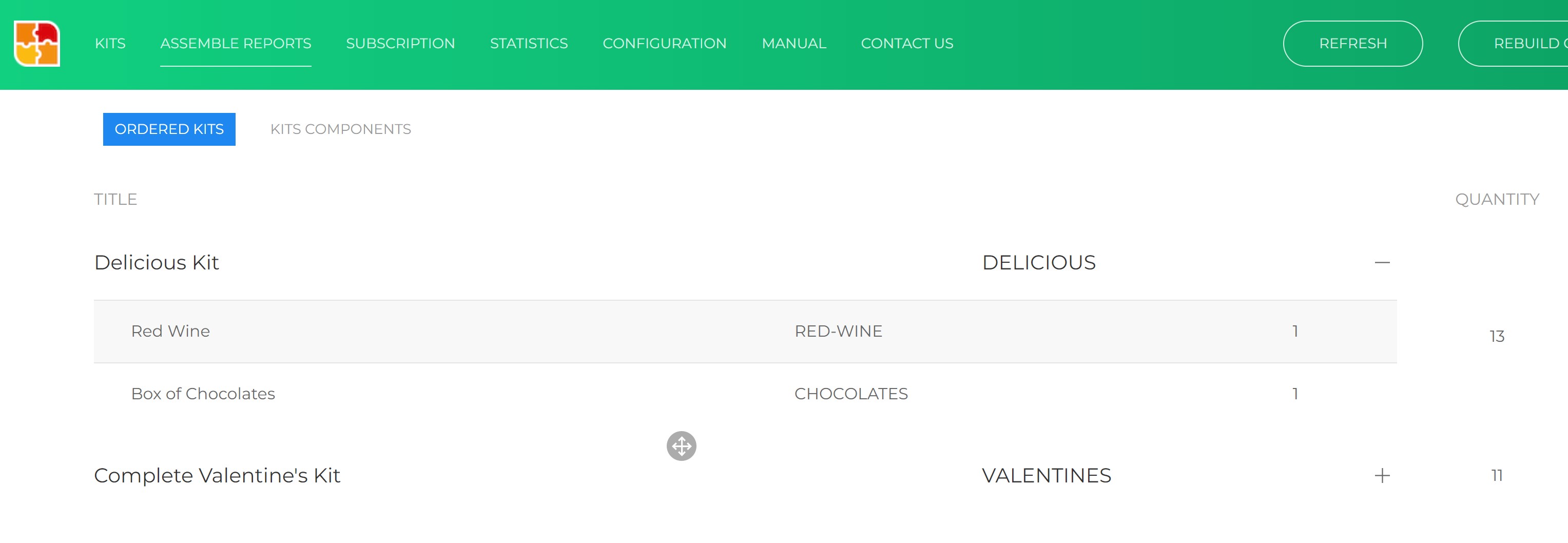 The Assemble Reports tab in Kit Builder provides a clear list of kits that have sold and need to be assembled and shipped. You can view this list by kit SKU, with the ability to expand each kit to see what components are required to build it. The complete flat list of components to build all kits requiring assembly is on the Kit Components tab.