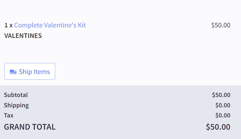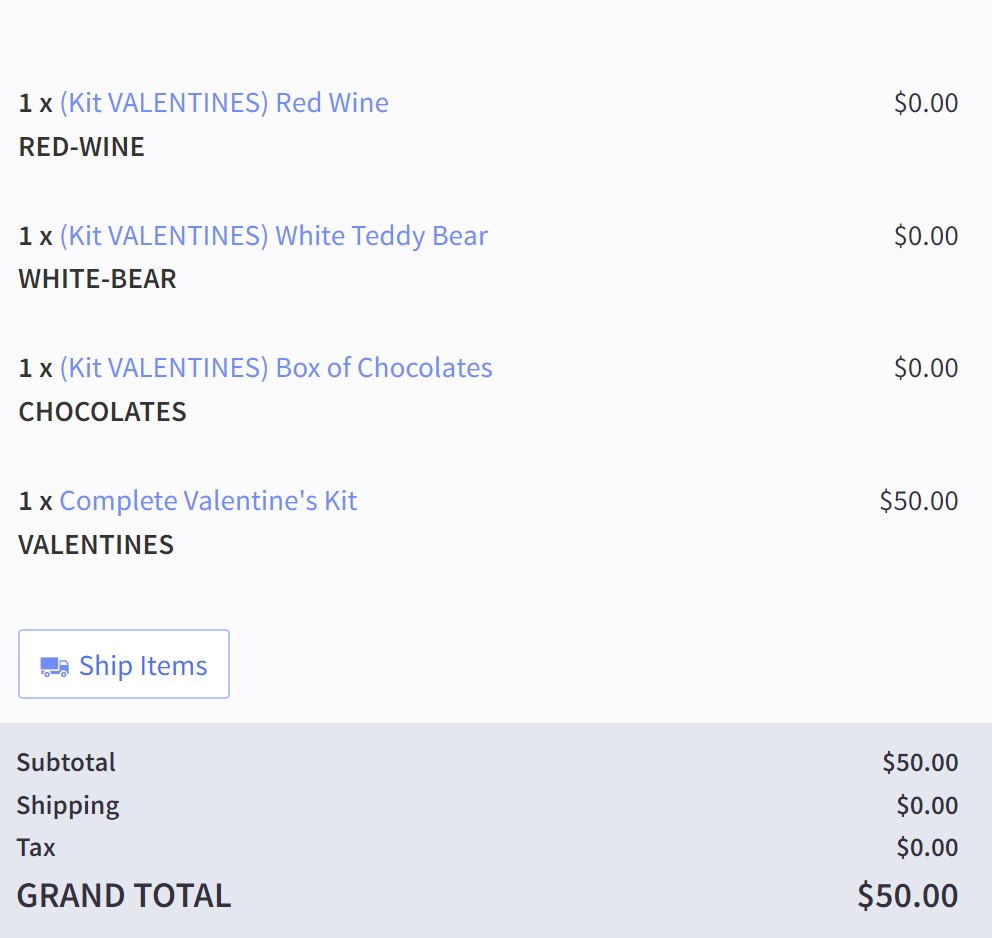 Let's step through an example of Kit Builder operation. The "Complete Valentines Kit" with SKU VALENTINES that you configured earlier is ready to be purchased! During creation, the component inventory levels were: